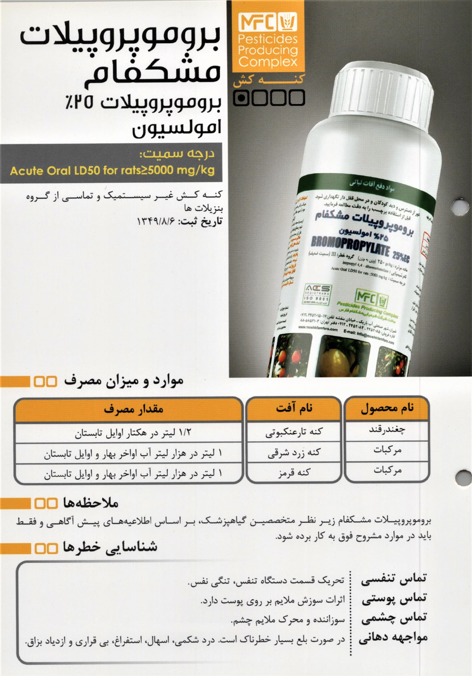 بروموپروپیلات(Bromopropylate25%EC) مشکفام فارس، کنه کش غیر سیستمیک و تماسی برای کنترل کنه دو نقطه ای چغندر قند و کنه های مرکبات